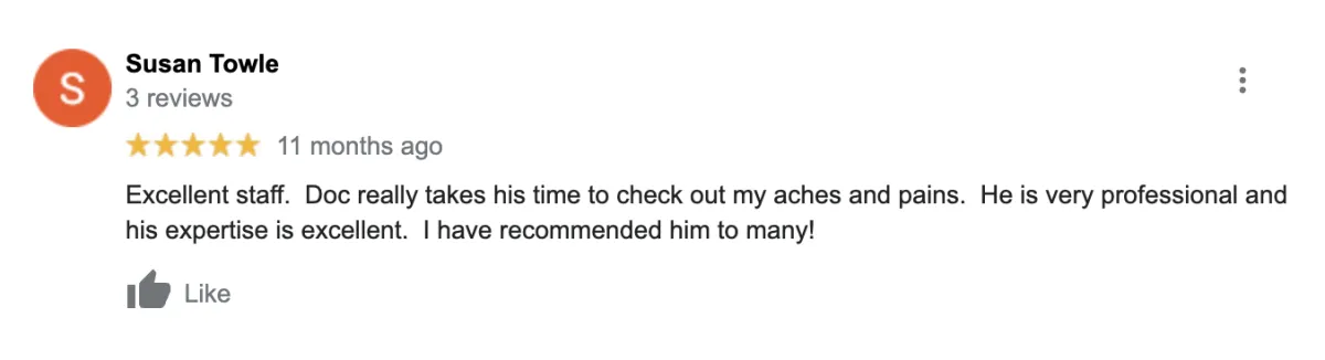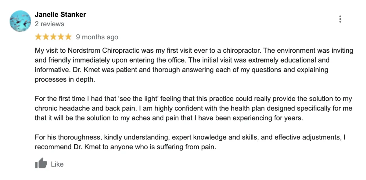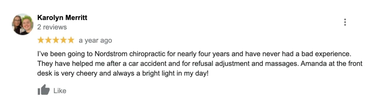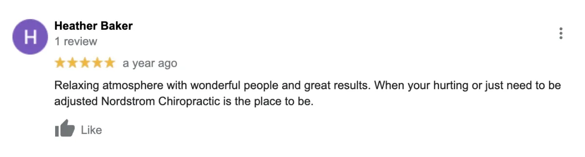 Disclaimer: Procedures and treatments performed by Nordstrom Chiropractic have an inherent success (and failure) rate. Reviews, testimonials and content on this site should not be interpreted as a statement of efficacy of procedures and treatments performed by Nordstrom Chiropractic for anyone else.